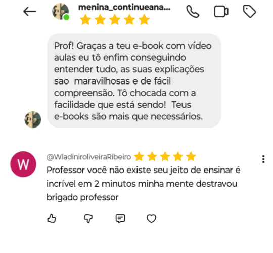 Dentro do e-book, antes de cada bloco de exercícios de cada tema, você encontrará um link exclusivo. Ao clicar nele, o vídeo da minha explicação abre direto no seu celular (YouTube). É simples e prático.
